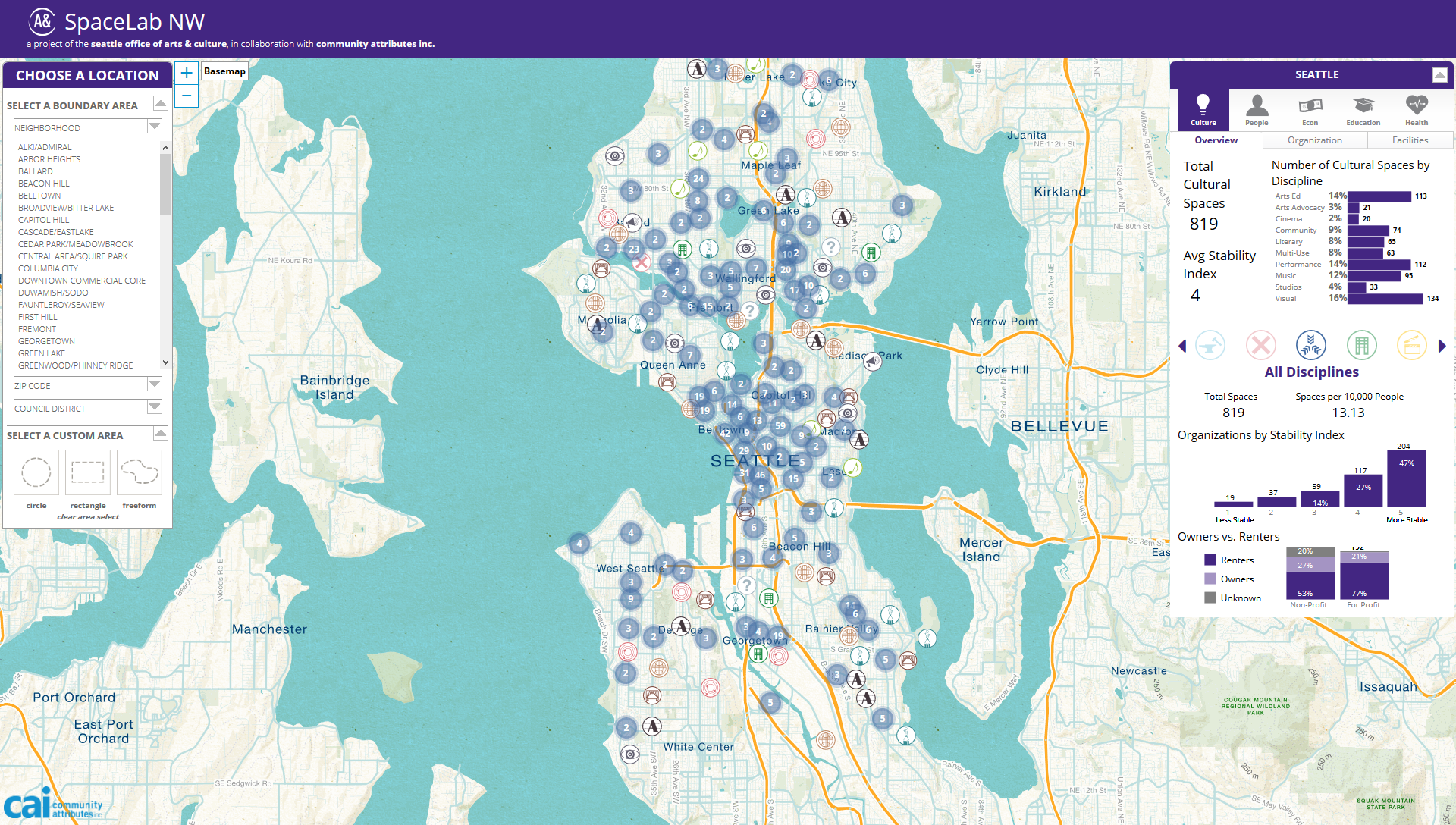 Explore the breadth and depth of Seattle's cultural world and its impact on our region. With this map you can discover how more than 850 arts and cultural spaces are correlated with demographic analysis; how 11 million square feet of cultural space is connected to Seattle's employment trends; and how more than 60,000 square feet of gallery space links to economic data. One city, one map.